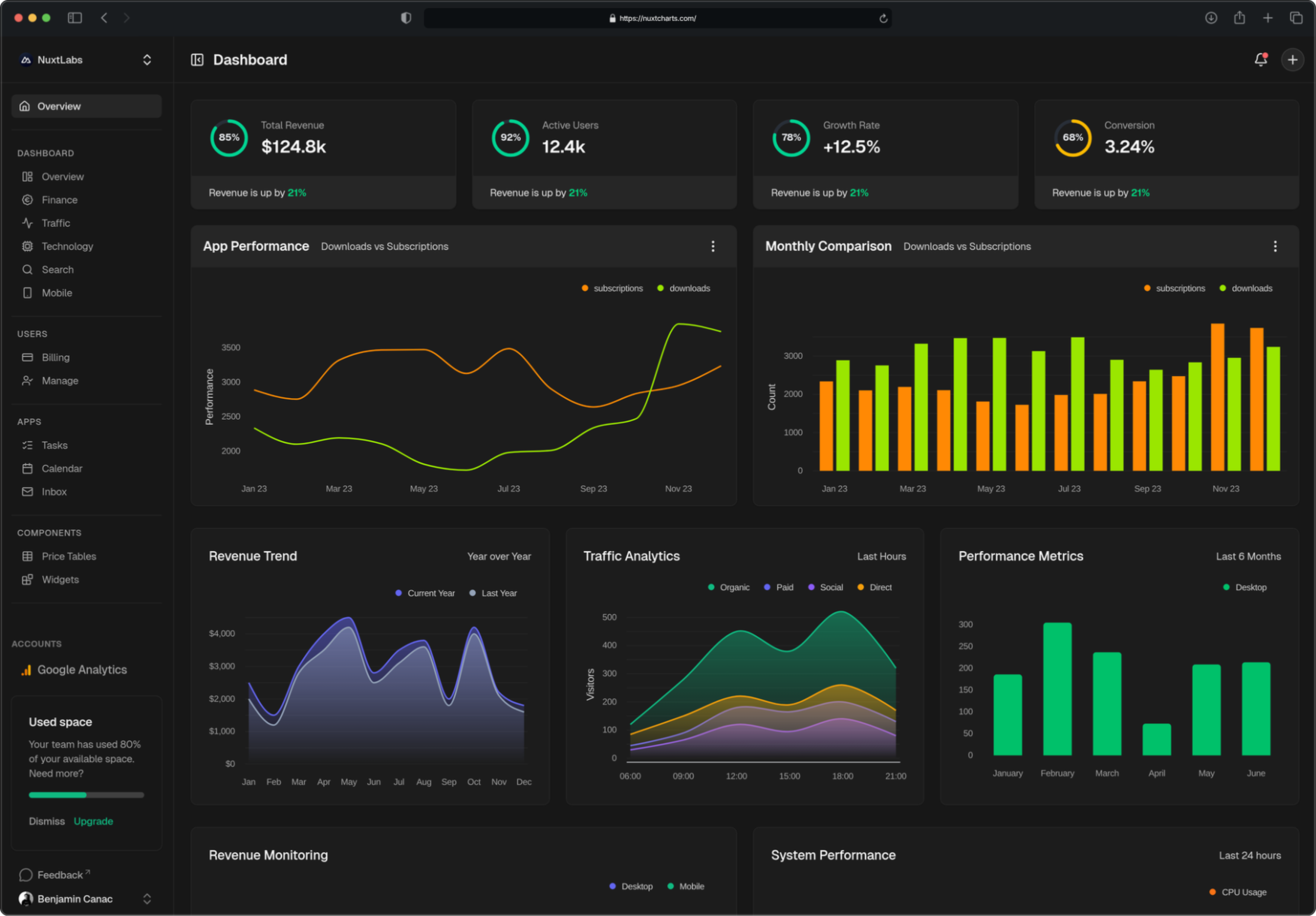 Build awesome admin dashboards in minutes. This Nuxt UI Dashboard template provides many chart composition, tables and pre-built layouts for your projects.